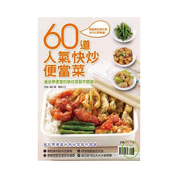 內容簡介: 博客來博客來網路書店【餐館裡的熱炒菜,也可以帶便當!】熱炒菜變個身,也可以裝進飯盒帶便當。你知道哪些熱炒菜適合帶便當嗎?便當中的菜色怎麼組合最速配?本書除了教你煮出香Q米飯外,更要告訴你如何挑選合適食材帶便當,還有現代人該有的便當製作健康新趨向,大火少油的烹調方式,還有便當中多蔬菜多健康的概念。將傳統的便當菜色擺一邊,輕鬆就將小館子裡的熱炒菜通通裝進便當盒中,不僅增添新鮮感,也讓帶便當。
